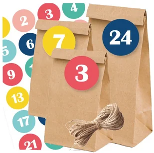 14 sztuk torebek 8x6,5x19 cm 10 sztuk torebek 10x7x28 cm - 24 okrągłe, kolorowe naklejki świąteczne z numerkami - każda z unikalnym wzorem - 10 metrów sznurka jutowego Torebki papierowe wykonane są z grubego, ekologicznego, brązowego papieru kraftowego.