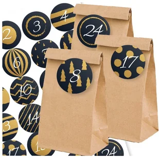 ❤️ KALENDARZ ADWENTOWY ❤️ Stwórz niezapomniane odliczanie do świąt! Dzięki codziennemu otwieraniu torebek magia Świąt pojawi się w Waszym domu już od początku grudnia. Kalendarz idealnie pomieści drobne upominki lub słodkości. Wystarczy nakleić numerek na torebkę i wrzucić prezent. W skład zestawu wchodzą: ⭐24 torebki papierowe eko w rozmiarze 8x6,5x19 cm ⭐24 kolorowe naklejki świąteczne z numerkami - każda z unikalnym wzorem Torebki papierowe wykonane są z grubego, ekologicznego, brązowego papieru kraftowego.