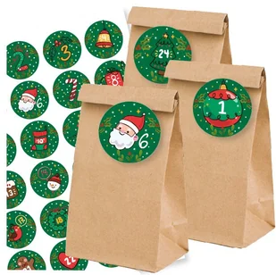 ❤️ KALENDARZ ADWENTOWY ❤️ Stwórz niezapomniane odliczanie do świąt! Dzięki codziennemu otwieraniu torebek magia Świąt pojawi się w Waszym domu już od początku grudnia. Kalendarz idealnie pomieści drobne upominki lub słodkości. Wystarczy nakleić numerek na torebkę i wrzucić prezent. W skład zestawu wchodzą: ⭐24 torebki papierowe eko w rozmiarze 8x6,5x19 cm ⭐24 kolorowe naklejki świąteczne z numerkami - każda z unikalnym wzorem Torebki papierowe wykonane są z grubego, ekologicznego, brązowego papieru kraftowego.