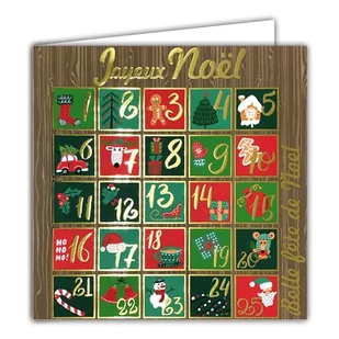 Kartka kwadratowa Wesołych Świąt w kolorze złotym z białą kopertą 15 x 15 cm - Kalendarz adwentowy 25 grudnia Impreza Koniec Roku Prezenty Dekorowanie Jodła Ciasteczka Oczekiwanie Mikołaja -