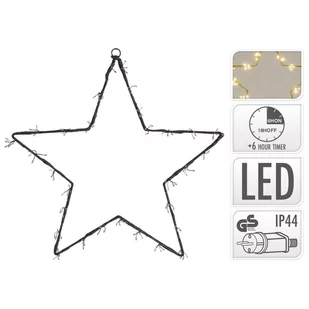 Gwiazda świąteczna druciana 120LED biała 40cm zasilanie sieciowe Gwiazda świąteczna druciana wkoło całej gwiazdy zapleciony jest drucik LED-owy, świecący ciepłym białym światłem. Świecąca dekoracja, która wprowadza w przytulny klimat świąt. Specyfikacja techniczna: kształt: gwiazda materiał: metal średnica: 40 cm kolor : brąz przewód: 5m adapter IP44 z timerem