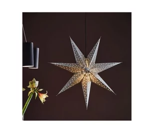 Dekoracja w kształcie gwiazdy świątecznej wykonana ze srebrnego papieru.
