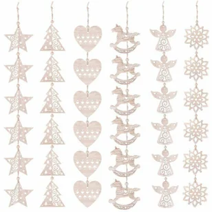 Parametry: Marka: SpringosWzór: kwiatki, aniołki, konik na biegunach, serca, choinki, gwiazdkiKolor: surowe drewnoMateriał: drewnoIlość sztuk: 36Wielkość zawieszek: