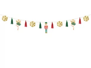 Girlanda papierowa Dziadek do orzechów, zestaw zawiera 6 tasseli w kolorach czerwonym i zielonym (po 3 z każdego koloru), 7 papierowych zawieszek (3 wzory) i ok. 3 m złotego sznurka. Długość ok. 2 m, wysokość ok. 16. 5 cm. Produkt do samodzielnego zlożenia.