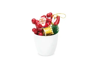 Stroik świąteczny z Mikołajem w białej doniczce plastikowej, idealna dekoracja na Boże Narodzenie. Wymiary: 8 cm x 14 cm. Opakowanie: 1 szt.