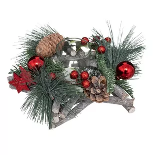 Świąteczna dekoracja - stroik z miejscem na świecę Stroik świąteczny z miejscem na świecę: Ten piękny stroik świąteczny to idealny dodatek do Twojego domu w okresie świątecznym. Wykonany z drewna, ma wymiary 20 x 8 x 20 cm, co sprawia, że doskonale pasuje do każdego stołu czy komody. Wielokolorowy: Stroik świąteczny jest ozdobiony zielonymi gałązkami, czerwonymi ozdobami i szyszkami, dzięki czemu dodaje wnętrzu radości i świątecznego klimatu.