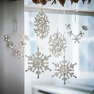 Różne ozdoby – w kształcie płatków śniegu, gwiazdki i listka. Zestaw z artystycznie szlifowanymi szklanymi kryształkami. Udekoruj nim gałązki, girlandy i inne dodatki. Nadaj swojej choince blask, na który zasługuje w te Święta! Ten sześcioczęściowy zestaw ozdób jest idealny na sezon świąteczny i wnosi zimową elegancję do każdego pomieszczenia w Twoim domu. Dzięki różnym motywom tworzy niepowtarzalnie elegancką atmosferę, która nie ma sobie równych.