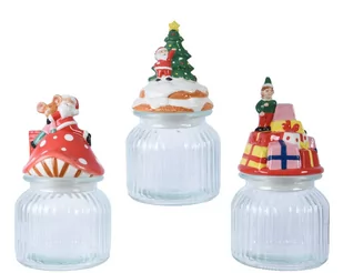Świąteczne słoiki szklane na ciastka słodycze 21cm Świąteczny, szklany, przezroczysty słoik to idealny sposób na przechowywanie i eksponowanie różnorodnych smakołyków świątecznych. Każdy słoik posiada unikalną ozdobę na zakrętce, która nawiązuje do świątecznych motywów. Można znaleźć wśród nich 3 różne warianty: prezenty, choinkę oraz postać Świętego Mikołaja, co dodaje im uroku i wyjątkowego charakteru. Słoik jest nie tylko praktyczny, ale także estetyczny, dzięki swojej transparentnej strukturze, która pozwala zobaczyć zawartość.