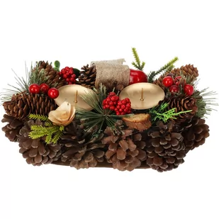 Brązowe szyszki i czerwone jagody tworzą harmonijną kompozycję, która wpasuje się w każde świąteczne wnętrze. Dodatki: Świecznik ozdobiony jest również jutową wstążką, co dodaje mu rustykalnego charakteru. Złote świeczniki: Dwa złote świeczniki wkomponowane w design dodają elegancji i są doskonałym tłem dla świec.