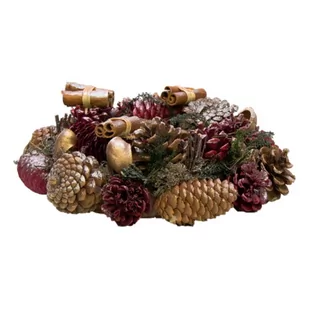 Wianek Świąteczny Dekoracyjny Ozdobny śr. 25 cm Dekoracyjny wianek, który doskonale sprawdzi się jako ozdoba stołu, drzwi, biura lub dowolnego miejsca. Posłuży jako podstawa bardziej rozbudowanej aranżacji, pięknie podkreśli jej zimowo-świąteczny charakter np. : z dodaną świecą albo gałązkami pachnącej choinki. Niezastąpiony jako dekoracja Świąteczna lub klimatyczny element wystroju wnętrza.