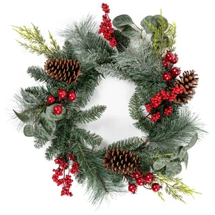 Wieniec z zielonych gałązek będzie świetnie wyglądać na drzwiach wejściowych lub na środku stołu. Ozdobiony jest czerwonymi jagodami, szyszkami i małymi liśćmi.