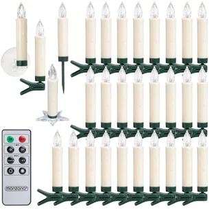 Świeczki choinkowe LED stworzą niepowtarzalny klimat świąt, bez plączących się kabli! Ekonomiczne, zasilane bateriami świece LED firmy MONZANA wprowadzą do Twojego domu świąteczny nastrój. Lampki choinkowe wykonane są w enerooszczędnej technologii LED. Dołączony pilot z 8 funkcjami umożliwia nam wygodne i łatwe sterowanie. Można wygodnie obsługiwać najważniejsze funkcje, takie jak timer (4 lub 8 godzin), poziom jasności (5-krotne ściemnianie) i rodzaj światła (migotanie świecy lub stały blask). Dzięki dodatkowym 52- cześciowym akcesoriom, Lampki można dopasować do własnej aranżacji świątecznej.