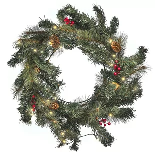 Ozdobiono go także sztucznymi szyszkami i jarzębiną, tworząc prawdziwie zimową kompozycję. Wykonany z materiałów syntetycznych, produkt nie wymaga częstej pielęgnacji, by wytrzymać wiele lat. Światła działają na baterie, więc możesz umieścić go w dowolnym miejscu, nawet daleko od kontaktu. Szczegóły: Typ produktu: Wianek Styl: