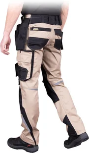 65% poliester, 35% bawełna - gramatura 300 g/m2 - zapinane na guzik i zamek błyskawiczny - cztery kieszenie po bokach, w tym dwie doszywane - doskonałe do przechowywania narzędzi - dwie kieszenie z tyłu, w tym jedna zapinana na rzep - kieszenie na nogawkach, w tym na telefon komórkowy - końcówka do przypięcia kluczy - na kolanach kieszenie na wkładki nakolannikowe zapinane na rzep - odblaskowe elementy - „S” shape - profilowane nogawki zapewniają lepsze dopasowanie się do sylwetki użytkownika - testowane na zawartość szkodliwych dla zdrowia substancji zgodnie ze standardami OEKO-TEX® Standard 100