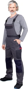 100% bawełna o gramaturze 260 g/m2 - wstawki z granatowego materiału 62% poliester, 34% bawełna, 4% spandex o gramaturze 240 g/m2 - kieszeń na klatce piersiowej zapinana na rzep - dwie boczne oraz dwie tylne kieszenie - trzy kieszenie na nogawkach, w tym jedna zapinana na rzep - gumka w pasie w bocznych partiach zwiększa swobodę ruchów oraz umożliwia lepsze dopasowanie - możliwość regulacji w pasie dzięki dodatkowym guzikom oraz długości szelek, które to dodatkowo mają w tylnej partii gumkę - na kolanach kieszenie na wkładki nakolannikowe - uchwyt na młotek na lewej nogawce - dzięki zastosowaniu spandexu spodnie lepiej dopasowują się do sylwetki, jednocześnie nie krępując ruchów - idealne na upalne dni