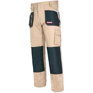 Regulacja szerokości w pasie za pomocą guzików. Oczko na klucze. Szlufka na młotek. Szlufki na pasek. Wzmocnione kieszenie oraz kieszenie na ochraniacze kolan materiałem (600D poliester) odpornym na przetarcia.