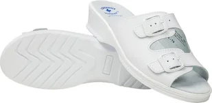 - cholewka wykonana ze skóry pokrytej powłoką ułatwiającą mycie i dezynfekcję - możliwość regulacji tęgości dzięki dwóm paskom z klamrami - wyściółka skórzana ze skóry naturalnej welurowej, impregnowanej środkiem bakterio i grzybobójczym podklejona pianką latex z dodatkiem węgla aktywowanego - spód PU z profilem ortopedycznym - protektor antypoślizgowy - podeszwa odporna na oleje, tłuszcze roślinne i zwierzęce - spełniają wymagania normy EN20347