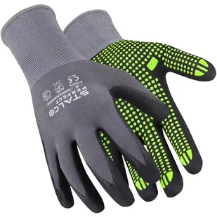 RĘKAWICE NYLONOWE / SAFETY GLOVES rękawice wykonane z spienionego nitrylu na części chwytnej na części zewnętrznej wykonane z przędzy nylonowej połączonej ze spandexem idealnie dopasowują się do dłoni lekkie wysoko odporność na ścieranie dzięki cienkiej ale bardzo wytrzymałej powłoce nitrylu 3x krotnie wytrzymalsze od podstawowych rękawic doskonały chwyt w suchych i lekko wilgotnych obszarach wysoka oddychalność dzięki spienionej strukturze, dłoń się nie poci podczas upalnych dni wysoki poziom czucia przy pracy z małymi częściami dodatkowo nakropione PCV aby zwiększyć przyczepność każda para blisterkowana zawieszką z kodem kreskowym Rękawice Robocze Nitrile Flex PVC Dots to: ochrona przed ścieraniem odporność na smary i oleje zwiększona chwytność wysoko elastyczność wysoka manualność ściągacz w nadgarstku