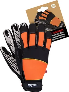 Rękawice ochronne wykonane z wysokiej jakości miękkiej skóry syntetycznej połączonej z tkaniną.