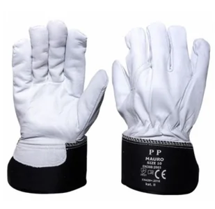 rękawice robocze, ochronne wykonane w całości ze skóry koziej, licowej całodłonicowe zakończone ściągaczem podgumowanym ze sztywnym mankietem pakowane po 12/120