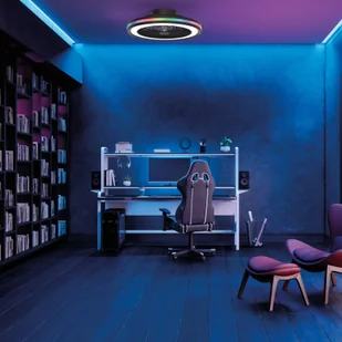 Wentylator sufitowy Gamer z pilotem, wewnętrznym wirnikiem i oświetleniem z funkcją CCT i RGB Wentylator sufitowy LED Gamer łączy w sobie orzeźwiający powiew powietrza z nowoczesnym oświetleniem ogólnym i nastrojowym. Wentylator znajduje się wewnątrz okrągłej obudowy. Ta ostatnia mieści od spodu mocną lampę LED, której światło można ściemniać i regulować temperaturę światła, a która świeci w dół na dużej powierzchni przez satynowaną osłonę. Z boku znajduje się również kolejny pierścień z wbudowanymi diodami LED RGB. Funkcje - prędkość wentylatora regulowana trzystopniowo - regulowana barwa światła (od ciepłej bieli do uniwersalnej bieli), nastrojowe światło RGB - światło ściemniane bezstopniowo Dzięki odwracalnemu kierunkowi obrotów wentylator może być używany w trybie letnim lub zimowym.