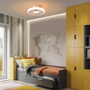 Latem uzyskuje się chłodzącą bryzę, natomiast zimą korzystne rozprowadzanie ogrzanego powietrza pomaga obniżyć koszty ogrzewania. Dane techniczne - Cichy silnik DC o mocy maks. 32 W - Wentylator z sześciostopniową regulacją: moc od 5 do 32 W, prędkość od 280 do 950 obr/min, cyrkulacja powietrza od 1080 do 3600 m³/h, głośność od 32 do 55 db - Barwa światła regulowana od ciepłej bieli (2700 K) do uniwersalnej bieli (5000 K) - Pilot w zestawie