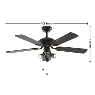Kontrastowy wentylator sufitowy Anariki ze stali i drewna dębowego Każdy, kto szuka stylowego wentylatora sufitowego, nie zawiedzie się na modelu Anariki. Jest on wykonany z czarnej stali i pięciu dębowych łopatek. W środku znajdują się trzy gniazda, do których można włożyć odpowiednie żarówki. Funkcje Dwa przełączniki pociągane na obudowie wentylatora sufitowego Anariki sterują jego obrotami i oświetleniem. Za pomocą przełącznika można zmienić bieg z do przodu na wsteczny.