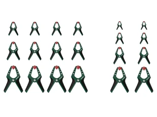 2x 76 mm, 2x 102 mm, 2x 152 mm, 2x 228 mm, Rozstaw i głębokość zacisku: 12-częściowy : ok. 35 x 44 mm, 44 x 39 mm, 60 x 67 mm; 8-częściowy : ok. 28 x 24 mm, 35 x 29 mm, 50 x 49 mm, 85 x 88 mm Materiał: tworzywo sztuczne, stal Waga: