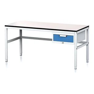 Stół warsztatowy MECHANIC II, 1600 x 700 x 745-985 mm, 1 kontener szufladowy, szary/niebieski