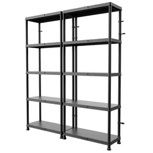 Przedstawiamy praktyczne i funkcjonalne rozwiązanie do przechowywania – zestaw dwóch regałów z pięcioma pojemnymi półkami.