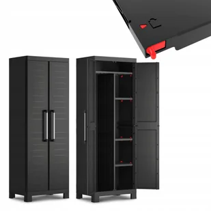 Szafka do przechowywania Detroit to nowa stylowa półka do domu, garażu lub szopy ogrodowej. Szafka nie nadaje się do użytku na zewnątrz. Ta plastikowa szafka do przechowywania z drzwiami ma 1 szeroką półkę i 3 mniejsze półki o regulowanej wysokości, z których każda może pomieścić do 10 kg. Ponadto szafka na miotły jest przeznaczona do przechowywania dużych przedmiotów, takich jak miotły, grabie lub odkurzacze. Sprawia to, że zamknięta szafa jest rozwiązaniem do przechowywania w każdym pomieszczeniu.