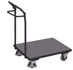 Variofit - kolor: RAL 7016, Wózek platformowy z poręczą i hamulcem postojowym, profil stalowy, platforma z płyty drewnopodobnej, kółka z łożyskiem, bieżnik z niebrudzącej gumy. Cechuje go wysoka odporność na uszkodzenia mechaniczne oraz zabezpieczenia w postaci m. in. hamulca i osłony stopy. Dostępny w czterech różnych rozmiarach.