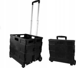 Składany wózek transportowy skrzynka, to wysoce uniwersalny wózek pozwalający w łatwy sposób transportować różnego rodzaju przedmioty o łącznej wadze nie przekraczającej 35kg. Wózek po złożeniu zajmuje niewiele miejsca, przez co może z powodzenie być przechowywany np. w bagażniku samochodowym. Posiada dodatkowe listwy usztywniające boczne ścianki skrzyni, listwy wystarczy wypiąć z dna skrzyni i nałożyć na górną krawędź ścianek. Wyposażony w teleskopowy uchwyt regulowany na dwie wysokości.