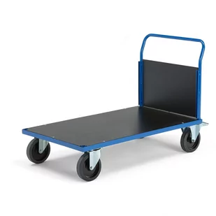Wózek platformowy o wytrzymałej konstrukcji z rur stalowych z praktyczną ramą, która służy też jako uchwyt do prowadzenia. Wyposażony w platformę z wytrzymałej płyty MDF i zdejmowaną ramę stabilizującą ładunek podczas transportu. Wózek platformowy z trwałych rur stalowych z platformą i burtą z MDF w kolorze czarnym. Wózek doskonale nadaje się do transportu w warsztatach i magazynach. Burtę na krótszym boku łatwo zdjąć, gdy zajdzie potrzeba. Umożliwia to transport dłuższych przedmiotów.