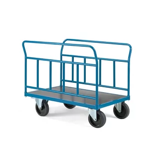 Wytrzymały wózek platformowy z ramami na dłuższych bokach, które pomagają chronić towary na wózku i służą także jako uchwyty. Posiada wytrzymałą platformę z trwałej płyty MDF, co jest doskonałym rozwiązaniem do transportu długich przedmiotów. Wózek posiada dwa koła stałe i dwa skrętne. Praktyczny i wytrzymały wózek platformowy do transportu ładunków w magazynach, warsztatach, jednostkach przemysłowych itp. Wózek posiada w pełni spawaną ramę stalową i mocne ramy na dłuższych bokach. Zarówno rama, jak i ramy boczne wykończone są lakierem proszkowym. Ramy boczne utrzymują ładunek bezpiecznie w miejscu podczas transportu i sprawiają, że wózkiem łatwiej się manewruje. Platformę wykonano z płyty MDF w kolorze czarnym.