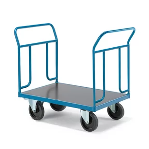 Wózek platformowy, który wytrzymuje duże obciążenia, wyposażony w dużą platformę załadunkową i zdejmowane ramy końcowe. Prezentowany wózek to doskonałe rozwiązanie do transportu ładunków o niestandardowych wymiarach oraz długich przedmiotów. Ramy końcowe z rur stalowych łatwo zdemontować na czas transportu długich przedmiotów. Wózek jest wyposażony w dwa koła stałe i dwa skrętne. Wszystkie koła wykonano z pełnej gumy. Wózek platformowy sprawdzi się idealnie podczas transportu przedmiotów o różnych kształtach i wymiarach w wielu środowiskach firmowych. Otwarte dłuższe boki pozwalają łatwo transportować na platformie ładunki o dużej szerokości.