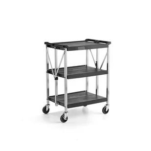 Składany wózek z półkami, który ułatwia wykonywanie różnorodnych zadań transportowych w miejscu pracy. Oferuje wytrzymałe półki wykonane z polipropylenu, idealne do trudnych warunków pracy. Po złożeniu wózek zajmuje bardzo niewiele miejsca. Składany wózek jest łatwy w transporcie i stanowi idealne rozwiązanie jako dodatkowe miejsce do przechowywania. Stanowi doskonałe rozwiązanie do stołówek, biur, warsztatów i magazynów. Wózek posiada solidną ramę ze stali nierdzewnej i wytrzymałe plastikowe półki.