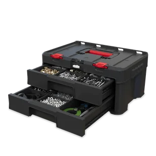 Skrzynka Stack'N'Roll z 2 szufladami to bardzo praktyczne rozwiązanie do przechowywania wszelkiego rodzaju wkrętów, gwoździ, śrub czy innych drobnych akcesoriów narzędziowych, a także wszelkiego rodzaju narzędzi hobbystycznych. Została stworzona z myślą o wszystkich tych, którzy cenią sobie wysoką jakość i funkcjonalność. Szuflady z pełnym wysuwem zapewniają maksymalny dostęp do zawartości, a specjalna listwa blokująca zapobiega przypadkowemu wyjęciu podczas transportu. Szuflady są wyposażone w wyjmowane przegrody, które pozwalają wykorzystać przestrzeń na przedmioty o różnych rozmiarach. Dodatkowo, skrzynia posiada górną rączkę z miękkim gumowym uchwytem oraz boczne uchwyty ułatwiające przenoszenie.