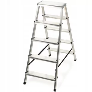 2x5 Rodzaj łączenia szczebli: nitowanie Wejście: dwustronne Maksymalne obciążenie: 125 kg Wymiary drabiny po rozłożeniu: 45 x 92,5 x 102 cm Wymiary drabiny po złożeniu: