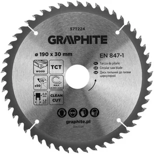 Tarcza do cięcia marki GRAPHITE 190 × 30 mm, 50 zębów. Widiowe zęby gwarantują czyste i szybkie cięcie drewna. W zestawie trzy pierścienie redukcyjne (30/25,4 mm, 30/20 mm i 30/16 mm).