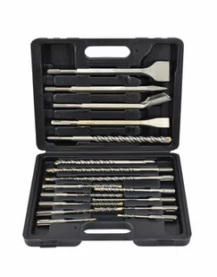 Całość w walizce. Zestaw zawiera: 12 x wiertła SDS+ (5x110, 6x110, 8x110, 10x110, 6x160, 8x160, 10x160, 12x160, 8x210, 10x210, 12x260, 14x260mm) 3 x dłuta płaskie (140x21, 250x20, 250x40mm) 2 x dłuta szpicaki (140x20, 250x20mm) Waga: 2,430 kg