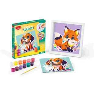 Malowanie po numerkach piesek i lisek Obrazki do malowania po numerach z motywami pieska i liska. Zestaw przeznaczony dla początkujących artystów, którzy dopiero rozpoczynają swoją przygodę z malowaniem. Zadanie polega na pomalowaniu kształtów kolorowymi farbkami zgodnie z oznaczeniem numerycznym. Każdy kolor farby jest opisany numerkiem, aby nie doszło do pomyłki. Wyraźne linie i liczby ułatwiające malowanie znikają pod farbą.