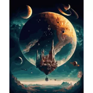 Fantastyczny pejzaż z innego wymiaru unosząca się wyspa pod tajemniczą planetą, pierścienie Saturna i odległe galaktyki. Ten obraz przenosi wyobraźnię w głąb kosmosu, inspirując marzenia i fascynację nieznanym. Poziom trudności: średniWymiary: 40x50 cmZawiera: