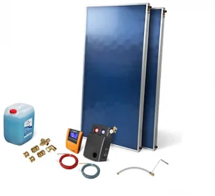 płaski kolektor słoneczny WEBER FX-PX 2,5 - 2 szt. sterownik solarny WEBER CONTROL CLASSIC PWM - 1 szt. grupa pompowa solarna, dwu drogowa PWM 15/4 - 1 szt. przewód oraz stelaż do zamocowania naczynia przeponowego zawór umożliwiający odłączenie naczynia przeponowego bez konieczności opróżniania układu z płynu - 1 szt. solarne naczynie przeponowe (zbiornik wyrównawczy) 18 l. - 1 szt. zestaw złączek do podłączenia kolektora przyłącze z odpowietrznikiem ręcznym i pochwą zanurzeniową na czujnik temperatury płyn solarny (koncentrat) lub 10 l gotowej mieszanki w zależności od dostępności.