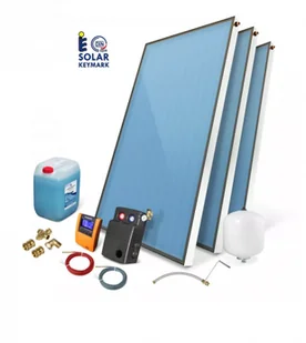 płaski kolektor słoneczny WEBER SOL STANDARD 2,0 - 3 szt. sterownik solarny WEBER CONTROL CLASSIC - 1 szt. grupa pompowa solarna, dwu drogowa 15/4 - 1 szt. przewód oraz stelaż do zamocowania naczynia przeponowego zawór umożliwiający odłączenie naczynia przeponowego bez konieczności opróżniania układu z płynu - 1 szt. solarne naczynie przeponowe (zbiornik wyrównawczy) 18 l. - 1 szt. zestaw złączek do podłączenia kolektora przyłącze z odpowietrznikiem ręcznym i pochwą zanurzeniową na czujnik temperatury płyn solarny (koncentrat) lub 20 l gotowej mieszanki w zależności od dostępności