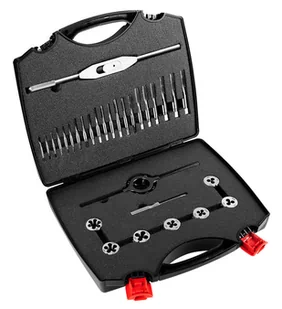 Zestaw gwintowników i narzynek, HSS M2, 31 szt. 90000402 marki BAILDON to zestaw narzędzi do gwintowania, zawierający gwintowniki ręczne DIN-352/3, oferowane w 3 sztukach: zdzieraka, pośredniego i wykańczaka, narzynki DIN-EN 22 568, pokrętło do gwintowników, oprawkę do narzynek i praktyczną plastikową walizkę wyposażoną w przekładkę zapobiegającą przemieszczeniu się elementów. Narzędzia wykonane zostały ze stali szybkotnącej HSS M2 (6542). Zestaw oferuje gwintowniki w rozmiarach: