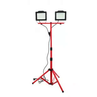 Wykonany z rury stalowej, malowany proszkowo. Trzy stabilne nogi statywu. Możliwość regulacji na dowolną wysokość. Model z podwójną głowicą, wyposażony w dwa reflektory SMD LED o mocy 50W. Soczewki z przezroczystego i hartowanego szkła.
