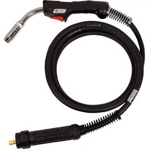 Kabel spawalniczy z chromowanym korpusem palnika. Ergonomiczny uchwyt palnika na przegubie kulowym zapewnia maksymalną elastyczność podczas spawania, dwie sprężyny spiralne na uchwycie i przyłączu zapewniają optymalną ochronę przed zagięciem.