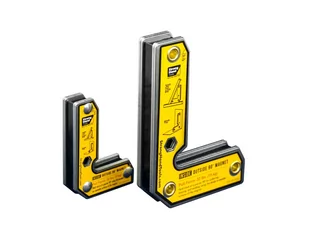 Zestaw dwóch magnetyczny kątowników narożny. Trzymaj i ustawiaj blachy, rury, elementy: okrągłe, kwadratowe, kątowe lub płaskie. Magnesy kątowe zbudowane są z dwóch niezależnych prostokątnych magnesów, co zapewnia stałą, nieumniejszoną siłę magnetyczną, gdy obie strony są przymocowane do przedmiotów obrabianych. Użyj otworów montażowych, aby połączyć ze sobą dwa magnesy, aby użyć ich jako elementów mocujących.