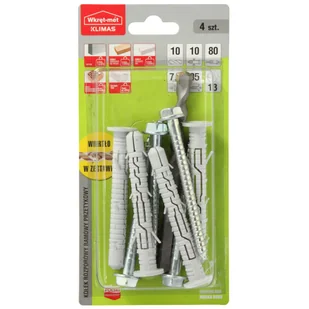 Kołek ramowy 10 x 80 mm 4 szt. Wkręt-met pozwala na mocowanie różnego rodzaju elementów, zarówno wykończeniowych, konstrukcyjnych a także wszelkich urządzeń. Stosowanie jest banalnie proste - wystarczy umieścić kołek w przygotowanym wcześniej otworze montażowym a następnie wkręcić dołączony wkręt lub śrubę. Poprawne i trwałe mocowanie za pomocą tego łącznika jest możliwe tylko przy zastosowaniu się do instrukcji umieszczonej na opakowaniu (średnica i głębokość otworu, grubość mocowanego elementu, rodzaj podłoża, przewidywane obciążenie).
